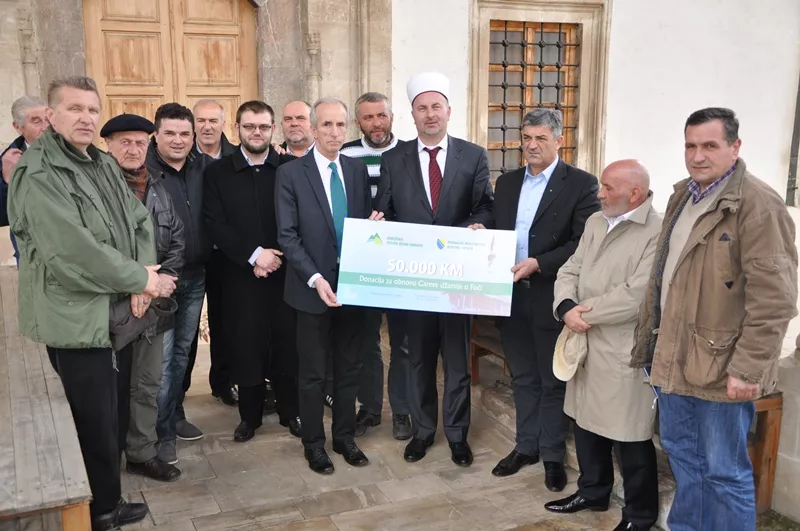 Prilikom jučerašnje posjete Foči predsjedavajućeg Općinskog vijeća Centar Nedžada Ajnadžića i člana Upravnog odbora Udruženja ''Istočna Bosna'' u Sarajevu, zajedno sa Šaćirom Hrustemovićem sekretarom Udruženja, te Munibom Milišićem, zamjenikom predsjednika Komisije Općinskog vijeća za mjesne zajednice i saradnju sa općinama i gradovima uručen je ček od 50.000 KM za obnovu srušene Careve džamije koja je nacionalni spomenik BiH, prenosi bh. novinska agencija Patria.