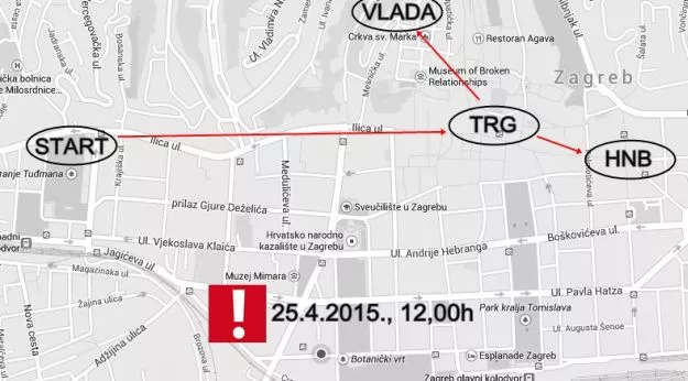 Demonstranti će se okupiti u subotu u podne na Trgu dr. Franje Tuđmana i krenuti prema Trgu bana Josipa Jelačića gdje će se podijeliti. Veći dio okupljenih će nastaviti prema Hrvatskoj narodnoj banci, dok će ostali otići pred Vladu Republike Hrvatske. Udruga Franak ovime želi simbolično poručiti kako je u Hrvatskoj glavni akter upravo HNB, a ne Vlada.