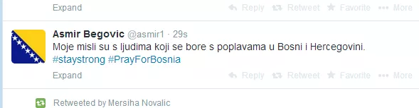 Golman bh. fudbalske reprezentacije i engleskog Stoke-a Asmir Begović koji je došao na okupljanje i pripreme bh. reprezentacije pred odlazak na Svjetsko fudbalsko prvenstvo u Brazilu uputio je na Twiteru poruku svim građanima BiH pogođenim poplavama.