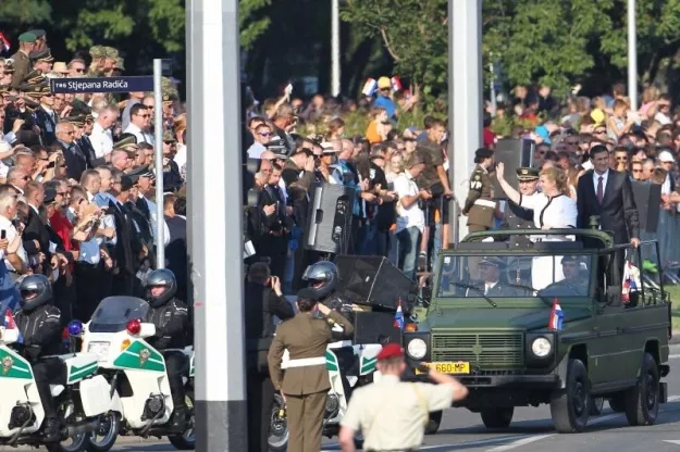 Predsjednica i vrhovna zapovjednica Oružanih snaga RH Grabar Kitarović obisla je i vojne postroje koji će učestvovati na mimohodu. Kolona je duga oko četiri kilometra. Ovacije građana izazvala je poljubivši hrvatsku zastavu.
