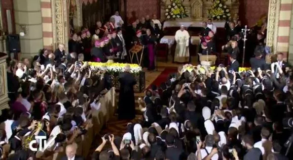 Susret u katedrali odvijat će se prema pripremljenoj i odobrenoj liturgiji sadržanoj u Vodiču za euharistijsko slavlje i susret duhovnih zvanja sa Svetim Ocem. Katedrala je ispunjena do posljednjeg mjesta.