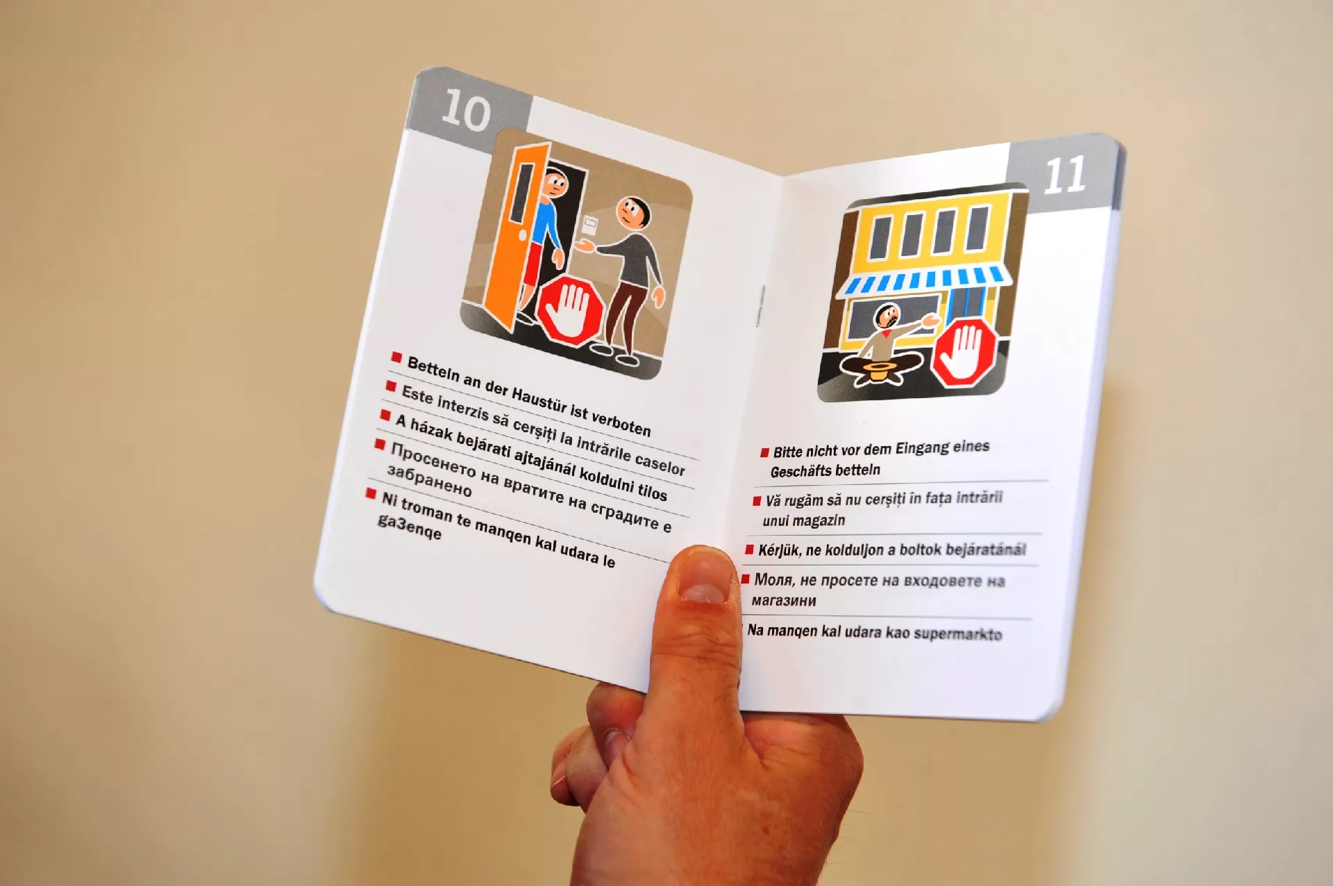 Brošura kojom se prosjacima objašnjava šta im je zabranjeno raditi prilikom prosjačenja, prevedena je na pet jezika: njemački, mađarski, rumunski, bugarski i romski jezik.