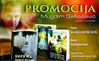 U ponedjeljak 29. decembra u 18 sati u u Galeriji Univerziteta u Doboju bit će održana promocija knjiga "Suze na mezaru", "Kapije života" i Ispod duge", autora Mugdima Galijaševića, piše novinska agencija Patria.