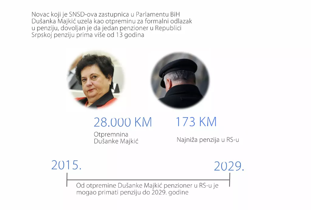 Novac koji je SNSD-ova zastupnica u Parlamentu BiH Dušanka Majkić uzela kao otpreminu za formalni odlazak u penziju, dovoljan je da jedan penzioner u Republici Srpskoj penziju prima više od 13 godina, piše bh. novinska agencija Patria.