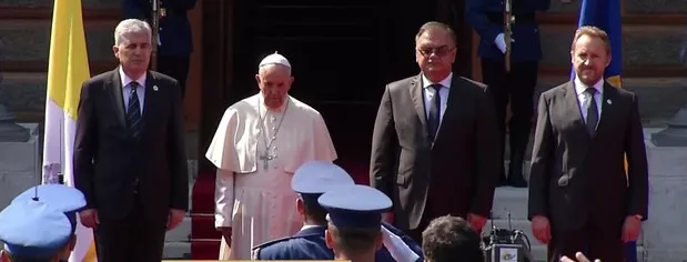 Kolona vozila stigla je ispred zgrade Predsjedništva BiH. Papu Franju dočekao je predsjedavajući Predsjedništva BiH Mladen Ivanić, javlja reporter novinske agencije Patria.