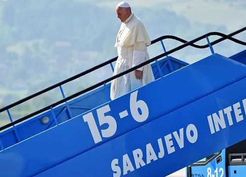 Tačno u 9 sati avion Alitalie u kojem se nalazi papa Franjo sletio je na Sarajevski aerodrom, piše novinska agencija Patria.