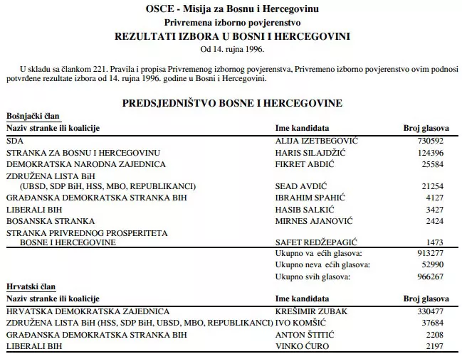Za hrvatskog člana Predsjedništva BiH pobijedio je Krešimir Zubak iz HDZ-a, osvojivši 330.477 glasova. I tada i ove godine u glasači su imali izbor od četiri imena.