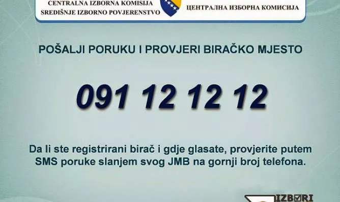 Također, još jednostavniji način jeste slanje besplatne SMS- poruke na broj 091 12 12 12. Dovoljno je da ukucate svoj jedinstveni matični broj i dobit ćete informaciju o adresi vašeg biračkog mjesta.
