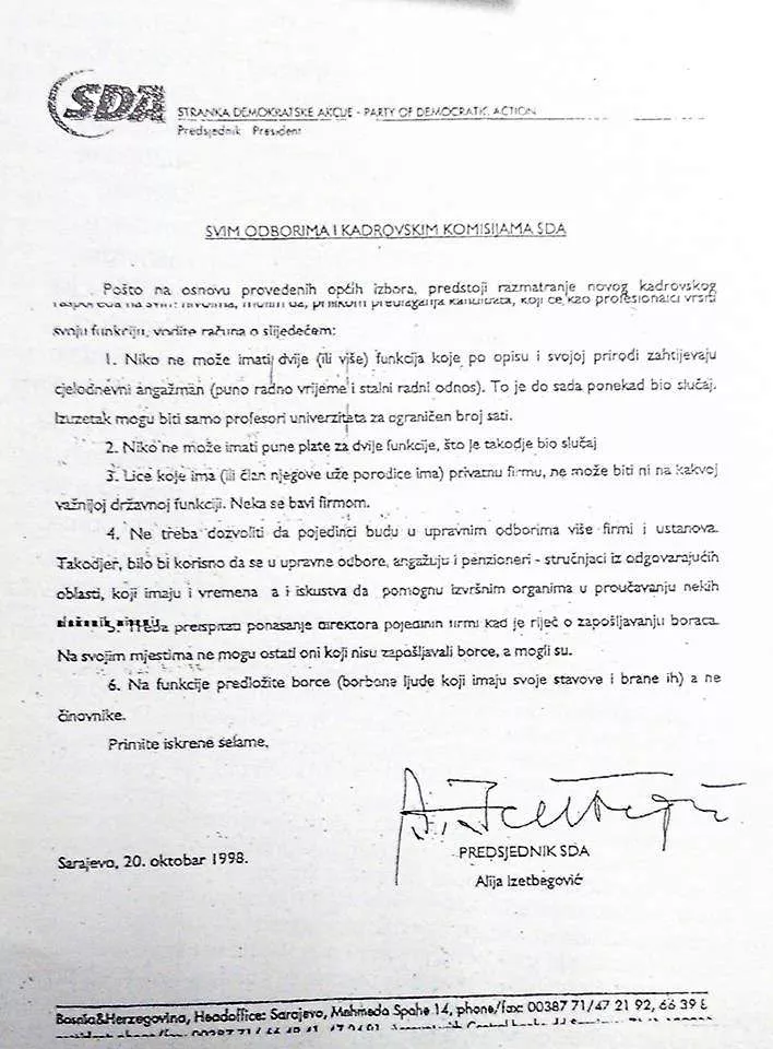 Nakon Općih izbora 1998. godine prvi predsjednik Predsjedništva RBiH i predsjednik SDA Alija Izetbegović uputio je dopis svim stranačkim odborima i kadrovskim komisijama dajući upute kako formirati vlast, odnosno raspodijeliti funkcije, piše novinska agencija Patria.
