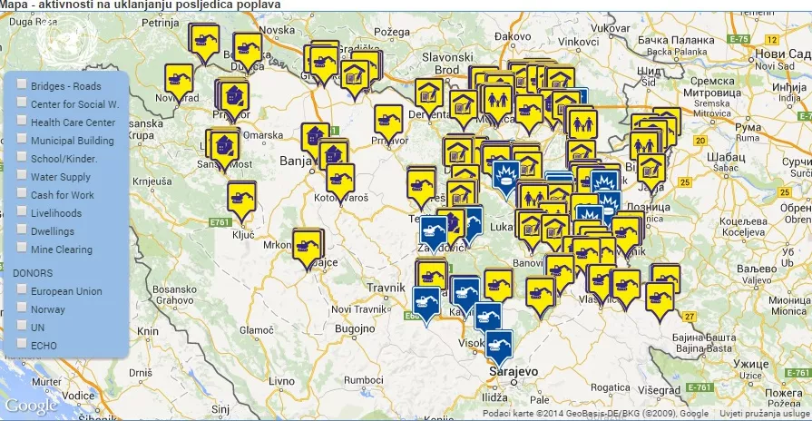 Žuti markeri označavaju aktivnosti koje se provode u okviru EU Programa za oporavak od poplava, koji finansira Evropska unija, a provode Razvojni program Ujedinjenih nacija (UNDP), Fond Ujedinjenih nacija za djecu (UNICEF) i Međunarodna organizacija za migracije (IOM).