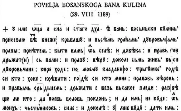 Povelja bosanskog bana Kulina je napisana 29. augusta 1189. godine na starobosanskom narodnom jeziku i bosanskim pismom bosančicom. Ovaj dokument je ne samo najstariji dosad pronađeni očuvani bosanski državni dokument, nego je Povelja bosanskog bana Kulina i najstariji državni dokument kod svih južnoslavenskih naroda i država, prenosi bh. novinska agencija Patria.