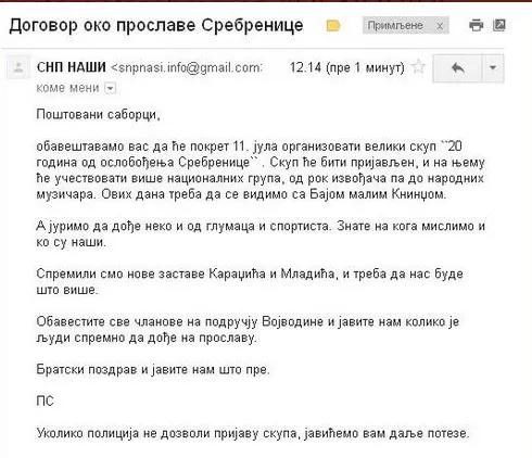 Desničarska organizacija SNP "Naši" iz Novog Sada na više mail adresa različitih udruženja uputila je obavještenje da će ovaj pokret 11. jula na dan dženaze i obilježavanja genocida u Srebrenici organizirati veliki skup „20 godina od oslobođenja Srebrenice“, piše novinska agencija Patria.