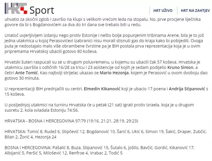 Na web stranici Hrvatske radio-televizije izbrisana je riječ bošnjačka, stavljeno reprezentacija BiH u tekstu o pripremnom turniru uoči Eurobasketa između selekcija Hrvatske i BiH, gdje je BiH poražena rezultatom 97:79.
