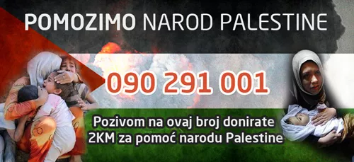 Pozivom na broj 090 291 001 donirate 2 KM za Palestince koji ostaju bez svojih domova nakon izraelskog bombarodavanja raketama velike razorne moći.