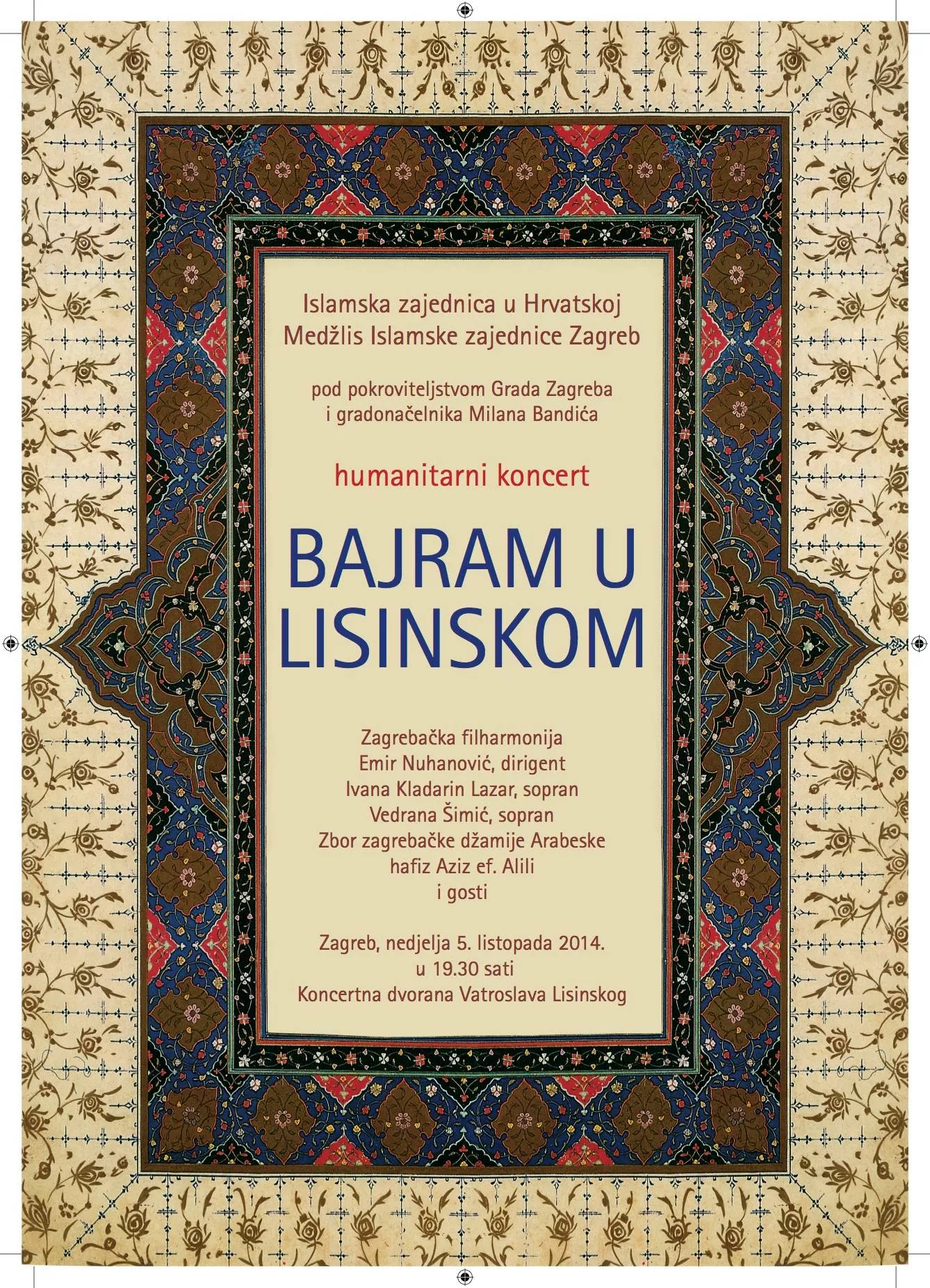 U dvorani Lisinki u Zagrebu 5. oktobra u 19.30 sati bit će održan humanitarni koncert "Bajram u Lisinskom". Ovim koncertom, koji se održava pod pokroviteljstvom gradonačelnika Grada Zagreba Milana Bandića počinje i zvanična saradnja eminentnog bh. umjetnika Emira Nuhanovića sa Zagrebačkom filharmonijom, piše bh. novinska agencija Patria.