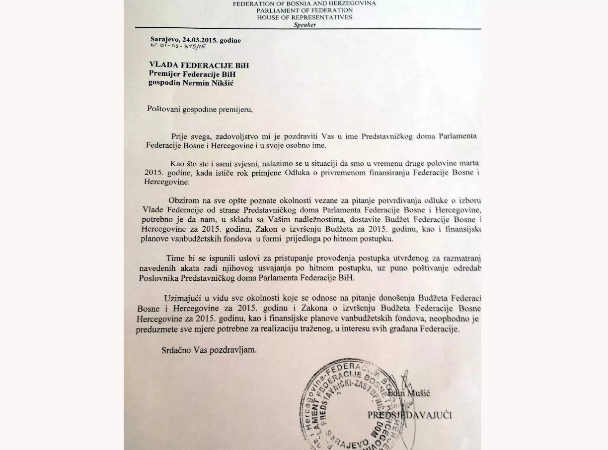 Edin Mušić, predsjedavajući Predstavničkog doma PFBiH pisao je premijeru Nerminu Nikšiću u kojem od njega traži da „obzirom na opće poznate okolnosti vezane za pitanje potvrđivanja odluke o izboru Vlade FBiH od strane PD PFBiH dostavi Budžet FBiH za 20015., Zakon o izvršenju Budžeta za 2015. godinu, kao i finansijske planove vanbudžetskih fondova u formi prijedloga po hitnom postupku“, saznaje novinska agencija Patria.