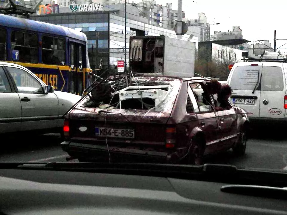 Iako je malo vjerovatno da se Opel Kadet u ovakvom stanju uopće može pokrenuti, sugrađani su fotografirali skoro raspadnuti aitomobil, ali koji uredno saobraća sarajevskim glavnim saobraćajnicama. Riječ je o romskoj porodici, a da stvar bude gora dvoje djece viri iz automobila koji je u pokretu!