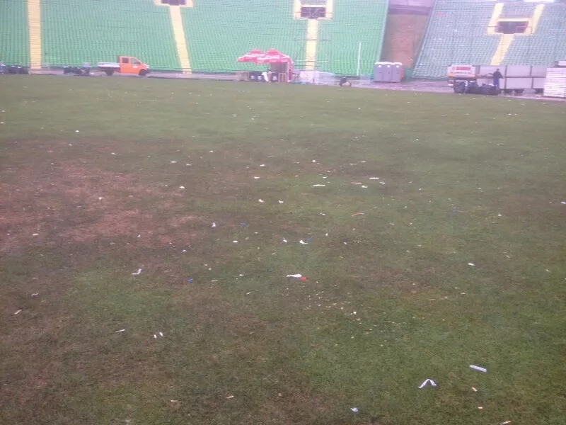 Nakon koncerta bh. kantautora Dine Merlina na stadionu Asim Ferhatović Hase na kojem je bilo skoro 70.000 posjetilaca, oštećen je teren kao i tartan staza, piše bh. novinska agencija Patria.