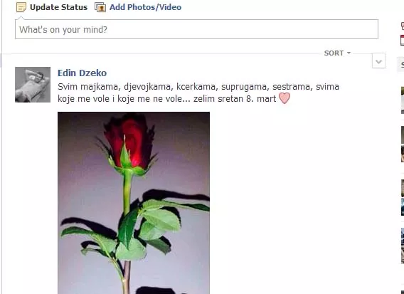 Edin Džeko, nogometaš Manchester Cityja i bh. reprezentativac svim ženama čestitao je 8. mart. Na svom Facebook profilu objavio je sliku crvene ruže i poruku: