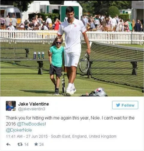 Maleni Džejk se našao na teniskom terenu, a protivnik mu je bio Nole, koji je u Londonu gdje se priprema za Vimbldon. Nakon ovog divno provedenog dana, dječak se zahvalio Novaku na Twitteru.
