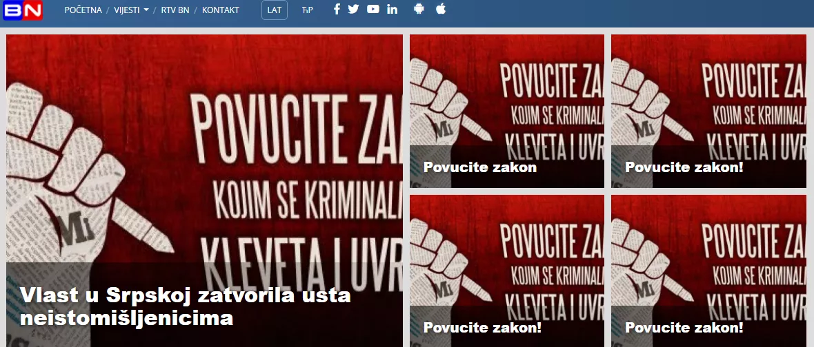 (Patria) - Usvojen je nacrt izmjena i dopuna Krivičnog zakonika Republike srpske u koji se uvodi kriminalizacija javne riječi. Vlast u Rs na ovaj način zatvorila je usta neistomišljenicima, pa su mediji poput RTV BN-a i portala Capital kompletnu stranicu posvetili upravo ovoj temi s identičnim slikama i jednim naslovom - Povucite zakon!
