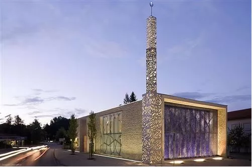 Kako se dalje pojašnjava, s obzirom da se u Njemačkoj ne može čuti ezan, onda je ispisivanje riječi ezana na minaretu ove džamije bilo jedno od rješenja za vjernike.