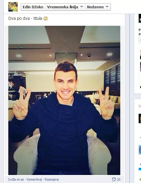 Bh. fudbalski reprezentativac i napadač Manchester Citya Edin Džeko na zvaničnoj Facebook fun page stranici ostavio je sliku s potpisom dva po dva-titula, prenosi bh. novinska agencija Patria.