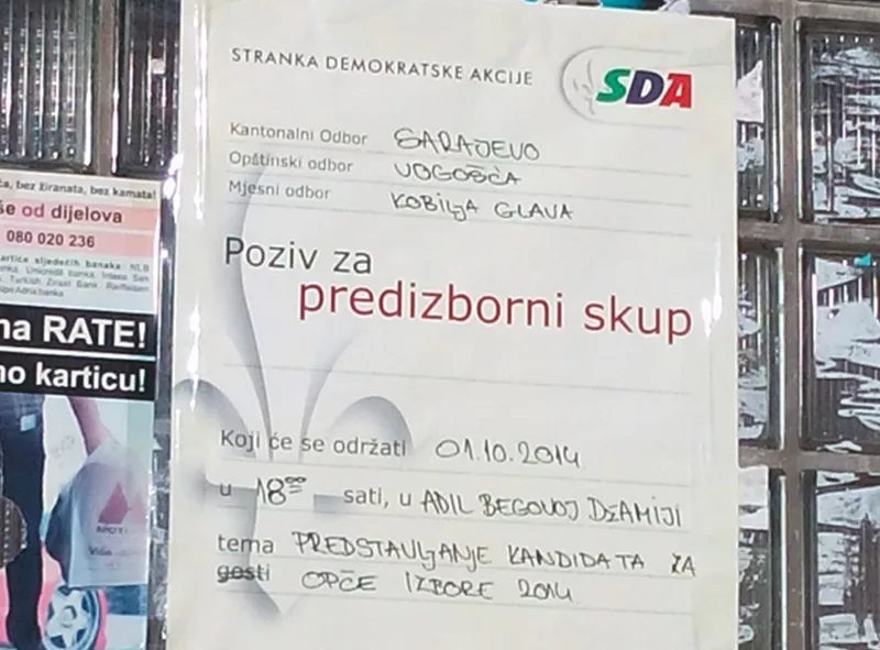 Predizborni skup SDA, Općinski odbor Vogošća, sutra će se održati u Adil-begovoj džamiji na Kobiljoj Glavi, a tokom posljednje dvije džume ispred nekoliko sarajevskih džamija dijeljen je promotivni materijal ove stranke.