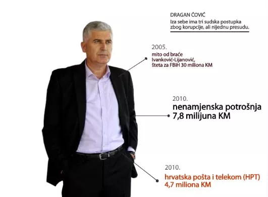 Čovićeva poslovna ali i politička karijera sve vrijeme obilježena je korupcijskim aferama i optužbama za enormno bogatstvo. Iako nikada nije osuđen na zatvorsku kaznu, do sada je tri puta sjedio na optuženičkoj klupi. Njegovo imee u ovom trenutku dovodi se u vezu i sa drugim aferama, u kojim istraga još nije pokrenuta.
