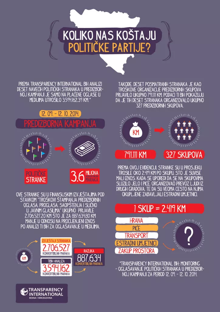Međutim, u postizbornim finansijskim izvještajima koje su stranke dostavile Centralnoj izbornoj komisiji BiH, ove stranke su pod stavkom “troškovi štampanja predizbornih oglasa, proglasa, saopštenja i slično u javnim glasilima” ukupno prijavile 2.706.527,2 KM, što je za 887.634,8 KM manje u odnosu na procijenjeni iznos po analizi TI BiH za oglašavanje u medijima.