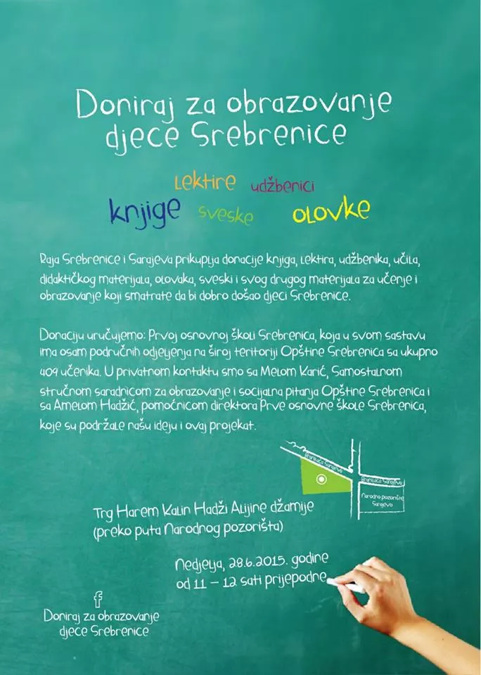 Svi koji žele darovati srebreničkoj djeci knjige, lektire, udžbenike, školski pribor, sveske i sve ono što im može pomoći u obrazovanju mogu to učiniti u periodu od 11 do 12 sati.