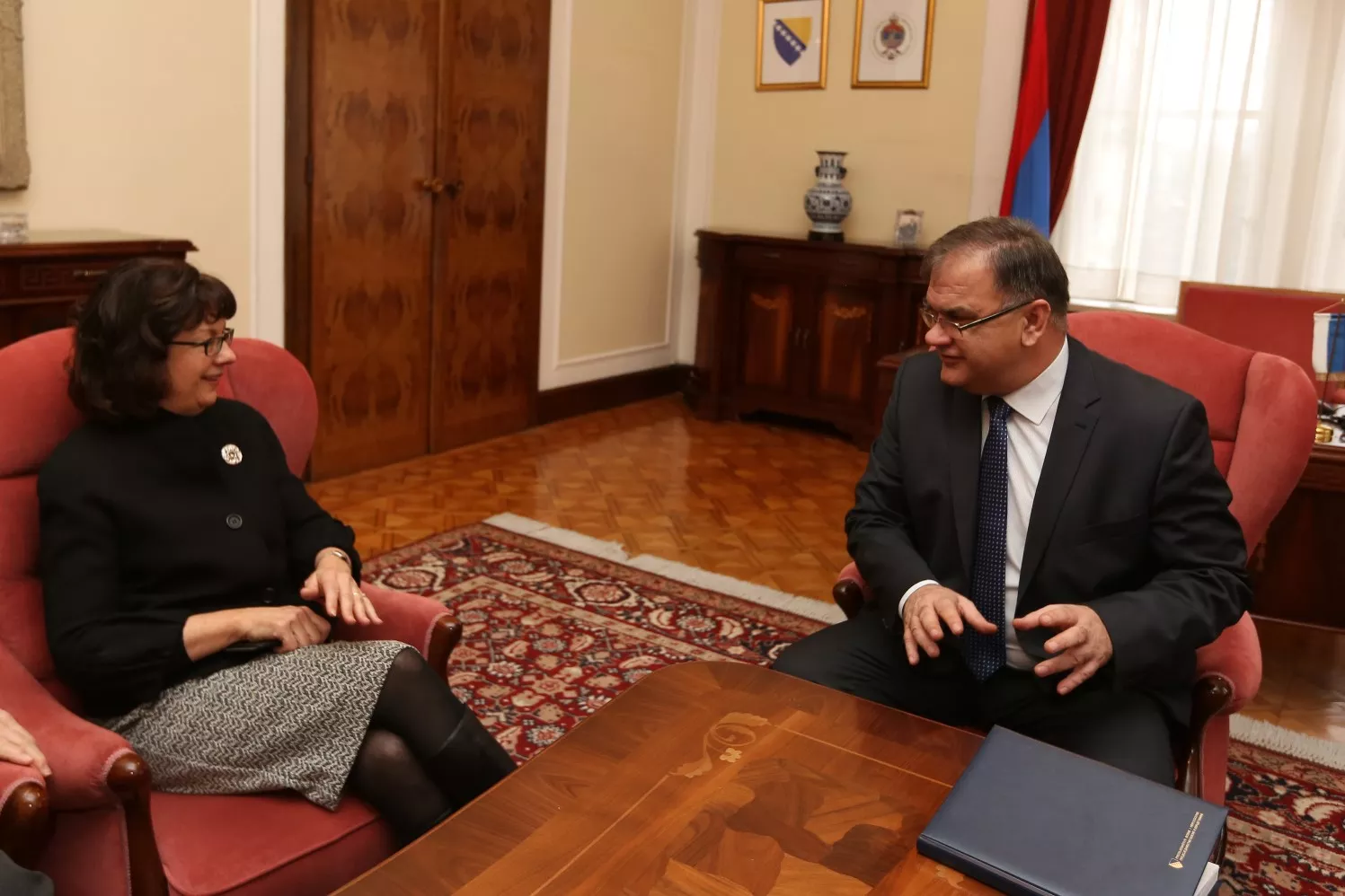 Predsjedavajući Ivanić je ambasadoricu SAD-a informisao o aktivnostima na konstituisanju organa vlasti u BiH, kao i aktuelnoj evropskoj inicijativi za BiH. Ovom prilikom je rečeno da će BiH nastaviti sprovođenje ranije sklopljenog dogovora oko državne imovine u vezi sa zahtjevima MAP-a.