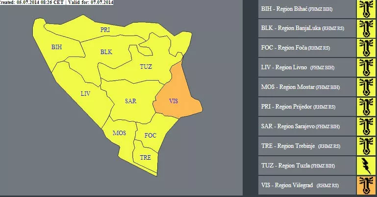 Naime, za sva područja BiH, osim za Višegrad upaljen je žuti meteoalarm koji zapravo znači da je neophodno pratiti vremenske uslove koji su potencijalno opasni. Ali, za Višegrad je izdato narandžasto upozorenje koje znači opasno vrijeme.