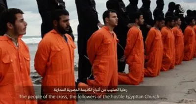 Na snimku se vidi grupa od 21 egipatskog kršćanina obučenih u narandžasta odijela, kojima su potom odrubljene glave, javio je Reuters.