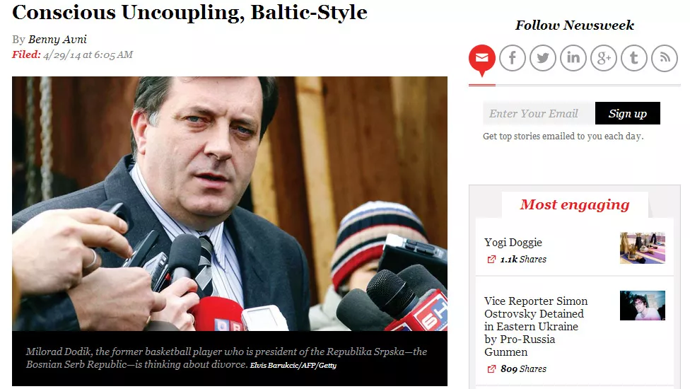 - Milorad Dodik, bivši košarkaš i predsjednik Republike Srpske, razmišlja o razvodu - navodi ugledni američki list Newsweek, prenosi bh. novinska agencija Patria (NAP). Dodik, kako navodi list, živi u slabašnom i lomljivom „balkanskom braku etničkih grupa koji je sklopila Amerika u Dejtonu."