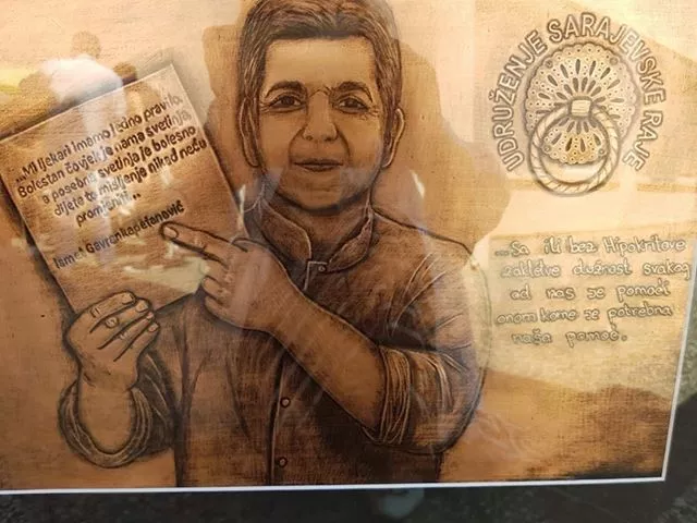 Predsjednik Udruženja Sarajevska Raja Nedim Ramic i djevojčica koja je postala simbol borbe za život protiv zdrasvtveng sistema koji ubija, Nadin Smajlović, uručili su sliku zahvalnosti i podrške profesoru Ismetu Gavrankapetanoviću.