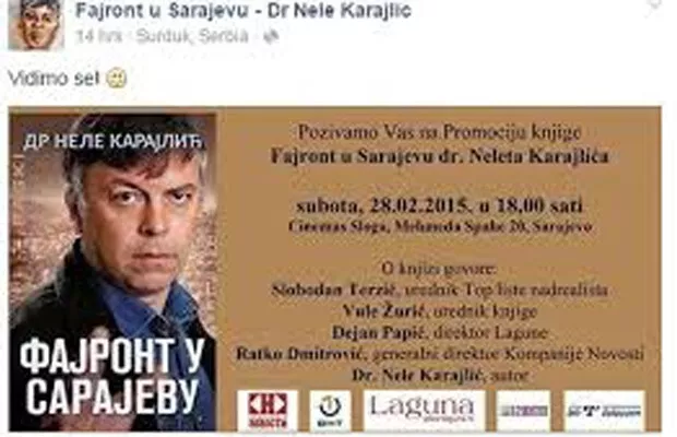 Na društvenim mrežama pojavila se obavijest i plakat koji navode BHT1 kao medijskog pokrovitelja promocije knjige Neleta Karajlića, prenosi novinska agencija Patria.