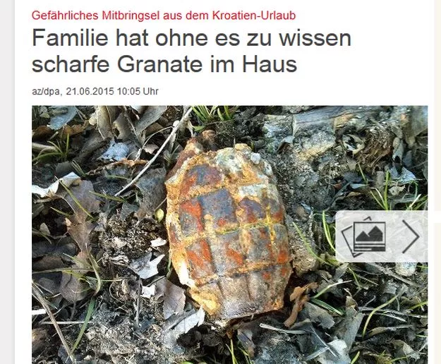 Njemačka porodica doživjela je ovog vikenda šok kada je jedan njezin član otkrio da je kamen kojeg su donijeli kao suvenir iz Hrvatske u stvari ručna granata, objavila je policija.