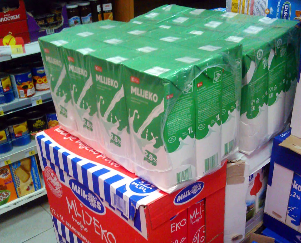 U slučaju koji je prikazan na fotografiji, da bi kupac došao do Milkosovog mlijeka, prvo mora skinuti Konzumovo mlijeko, otvoriti kartonski paket, pa tek onda doći do mlijeka bh. proizvođača.