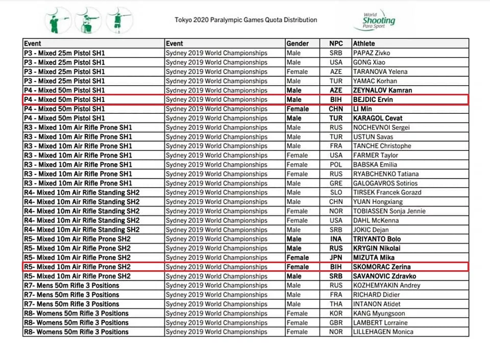SARAJEVO, (Patria) - Ervin Bejdić i Zerina Skomorac, bosanskohercegovački takmičari u Para Shootingu osigurali su nastupe na Paraolimpijskim igrama, koje će naredne godine biti održane u japanskoj prijestolnici Tokiju.