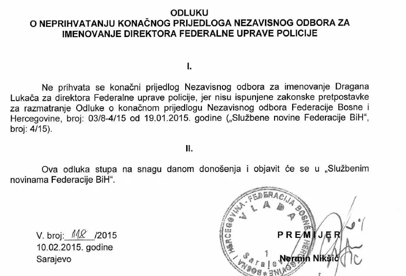 Jednoglasna odluka Vlade FBiH koju je potpisao premijer Nermin Nikšić o neprihvatanju konačnog prijedloga Nezavisnog odbora za imenovanje Dragana Lukača na direktora FUP-a, stupila je na snagu danom donošenja 10. 02. 2015., piše bh. novinska agencija Patria.