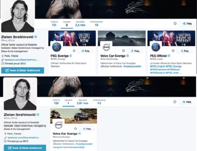 Ibrahimović je na svom Twitteru profilu do sada pratio samo tri naloga. Švedski Volvo koji mu je sponzor., zatim zvanični nalog PSG kao i nalog za navijača PSG-a u Švedskoj. Od danas Ibra prati jedino Volvo, pošto je otpratio dva naloga kluba čiji je član.