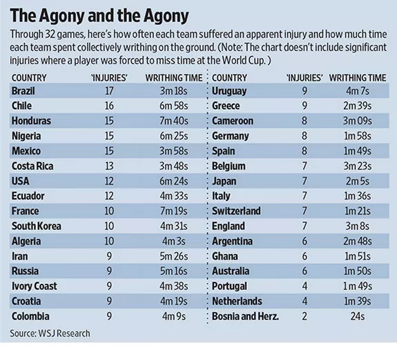 Selekcija koja ubjedljivo vodi po broju simuliranih povreda je Brazil. Njihovi igrači su u dvije utakmice čak 17 puta ležali na terenu. Od toga samo je Neymar bio pet puta na travi, najviše u svom timu. U prosjeku je ustajao nakon 15 sekundi. To je ukupno oduzelo 3 minute i 18 sekundi.
