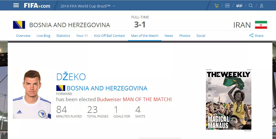 Edin Džeko proglašen je u zvaničnom izboru FIFA-e za igrača utakmice BiH-Iran, javlja bh. novinska agencija Patria (NAP). To je prvi put u historiji da jedan naš igrač dobije takvo priznanje, i bude zvanično proglašen za najboljeg igrača meča na Svjetskom prvenstvu.