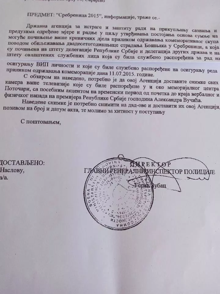 Osuđeni direktor SIPA-e Goran Zubac uputio je dopis Javnom RTV servisu da im dostave sve snimke kamera koje su se 11. jula nalazile u i oko Memorijalnog centra Potočari.