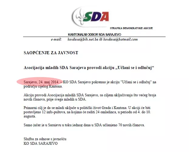 Kantonalni odbor Stranke demokratske akcije Sarajevo danas je izdao saopćenje za javnost da su pokrenuli akciju "Učlani se i odlučuj" na području cijelog KS, piše novinska agencija Patria. I tu ne bi bilo ništa čudno da datum sapoćenja nije 24. maj 2014. godine (?!).