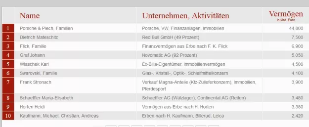 Ukupna imovina porodica Porsche i Piech povećala se u odnosu na prošlu godinu s 44,8 na 65 milijardi eura, izračunao je "trend". Na drugom mjestu nalazi se vlasnik Red Bulla Dietrich Mateschitz sa 7,6 milijardi, ispred porodice Flick sa 7,2 milijardi eura.
