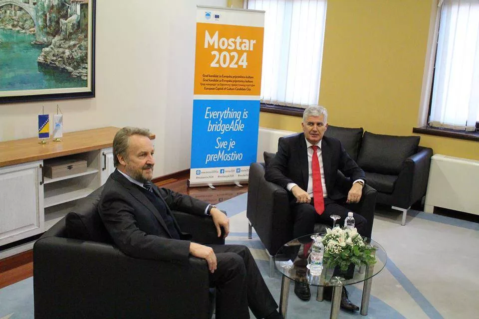 MOSTAR, (Patria) - U Gradskoj vijećnici u Mostaru održava se sastanak delegacija HDZ BiH i SDA koje predvode predsjednici stranaka Dragan Čović i Bakir Izetbegović. Njih dvojica prvo su razgovarali sami 20-ak minuta, a onda su se priključile i delegacije. Sa Izetbegovićem su došli Adil Osmanović, zamjenik predsjednika SDA i Šefik Džaferović, potpredsjednik SDA.