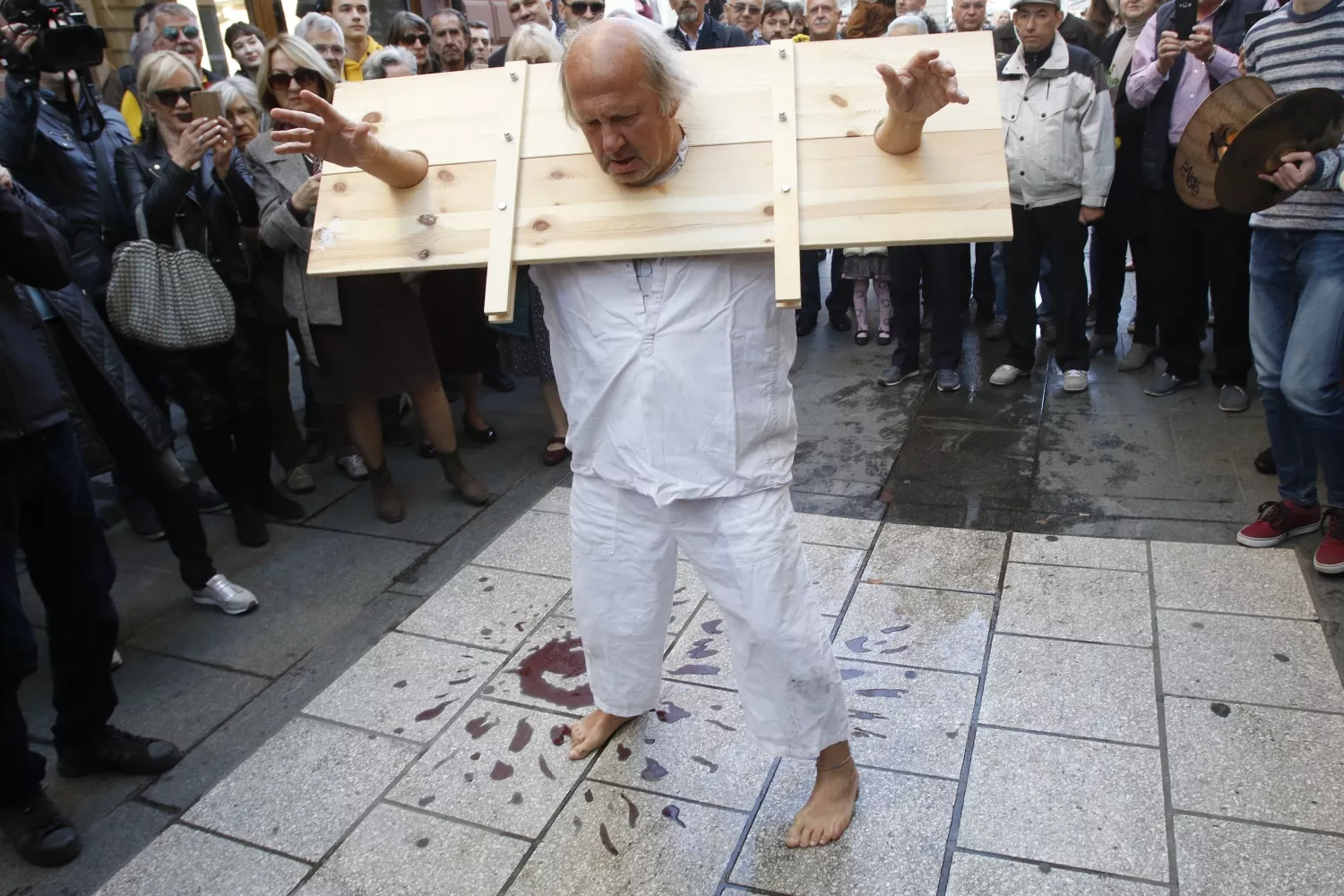 SARAJEVO, (Patria) - Glumac, reditelj, umjetnik Zijah A. Sokolović danas je izveo performans u centru Sarajeva povodom 50 godina profesionalnog glumačkog rada. On je na rukama i glavi nosio „daske koje život znače“. Pojasnio je da se te daske mogu dvojako tumačiti – da se on ukovao u daske kao glumac ili da se ukovao kao što su se nekad kroz historiju ukivali razbojnici, lopovi, kradljivci...