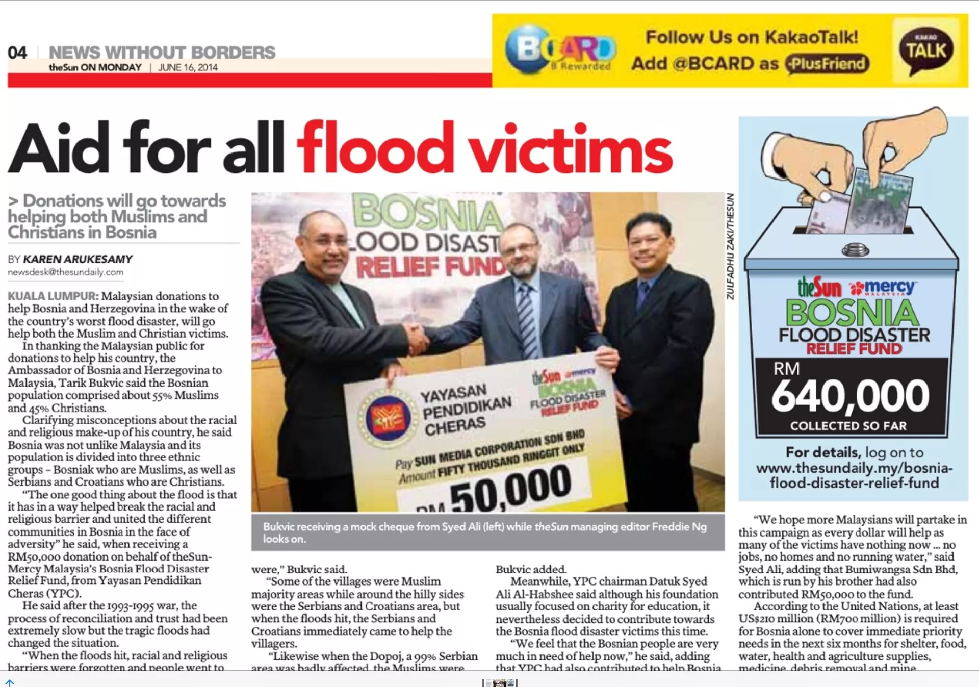 U međuvremenu je predsjedavajući YPC-a Datuk Syed Ali Al-Habshee rekao da, iako je njegova fondacija obično fokusirana na dobrotvorne aktivnosti u oblasti obrazovanja, ipak su odlučili da ovaj put daju doprinos za žrtve poplava u Bosni.